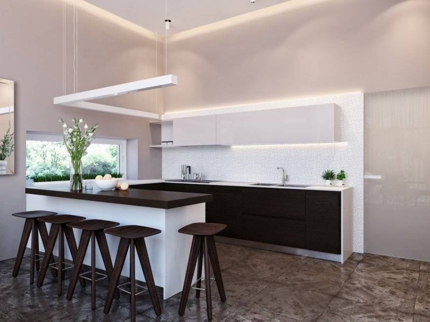Чтобы сэкономить место, оставить больше пространства для установки дивана, тумбы для телевизора, вместо обеденного стола-острова устанавливают узкую барную стойку. Это отличное решение для небольшой семьи. Барная стойка смотрится по-современному, экономит квадратные метры, иногда может заменять рабочую поверхность.