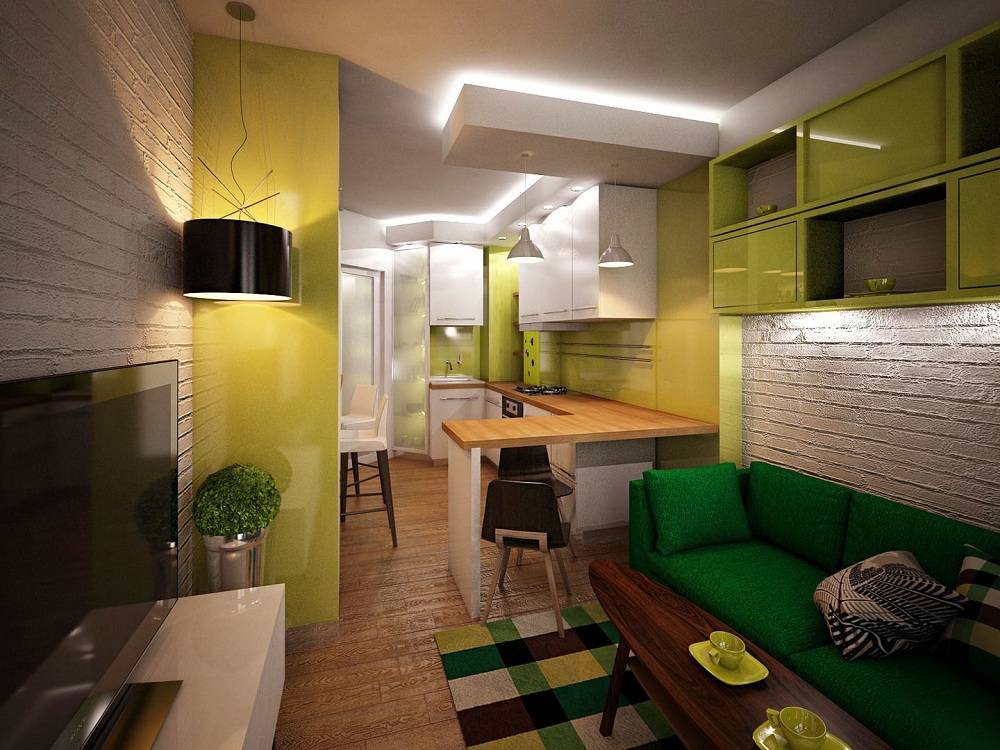 Если квартира состоит из одной комнаты, коридора и санузла, то создание кухни-гостиной – единственный приемлемый вариант для ее владельца. Здесь важна не только дизайнерская задумка, но и практичный подход, так как комната выполняет функцию спальни. В рабочей зоне необходима вытяжка (впрочем, ее наличие желательно на всех кухнях), а также продуманная система хранения. Если владелец студии обходится малым количеством вещей, можно оставить стены в зоне готовки открытыми – это добавит интерьеру простора.