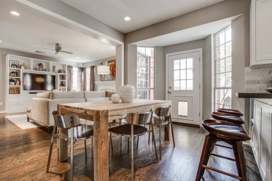 Чтобы интерьер столовой, совмещенной с кухней и/или с гостиной выглядел слаженным и гармоничным, ее нужно зонировать визуально или предметами. Вот несколько подсказок, как это можно сделать: