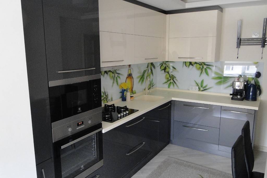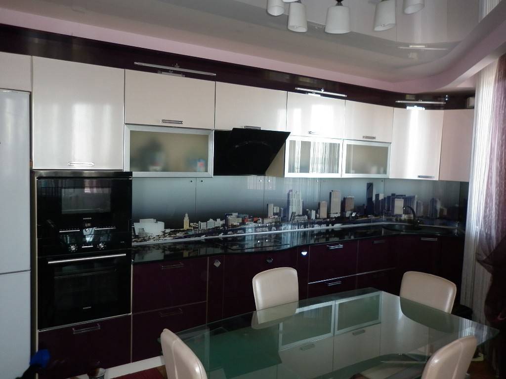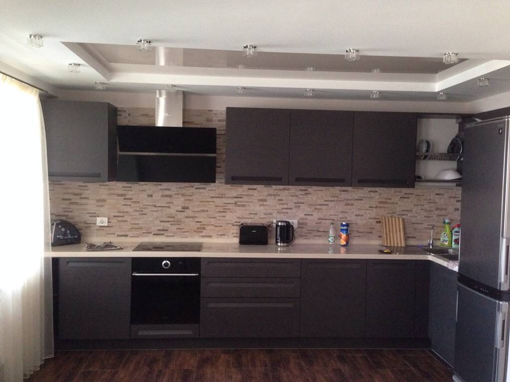 Можно подобрать цвета под натяжные потолки. При выборе такого решения можно заказать фотопечать на пленку, в которой будут использованы оба цвета гарнитура. При этом фактура пленки может быть похожей с фасадами шкафов либо, наоборот, разниться с ними. Глянец на шкафчиках и напольных столах отлично сочетается с матированным и сатиновым покрытием натяжного полотна.