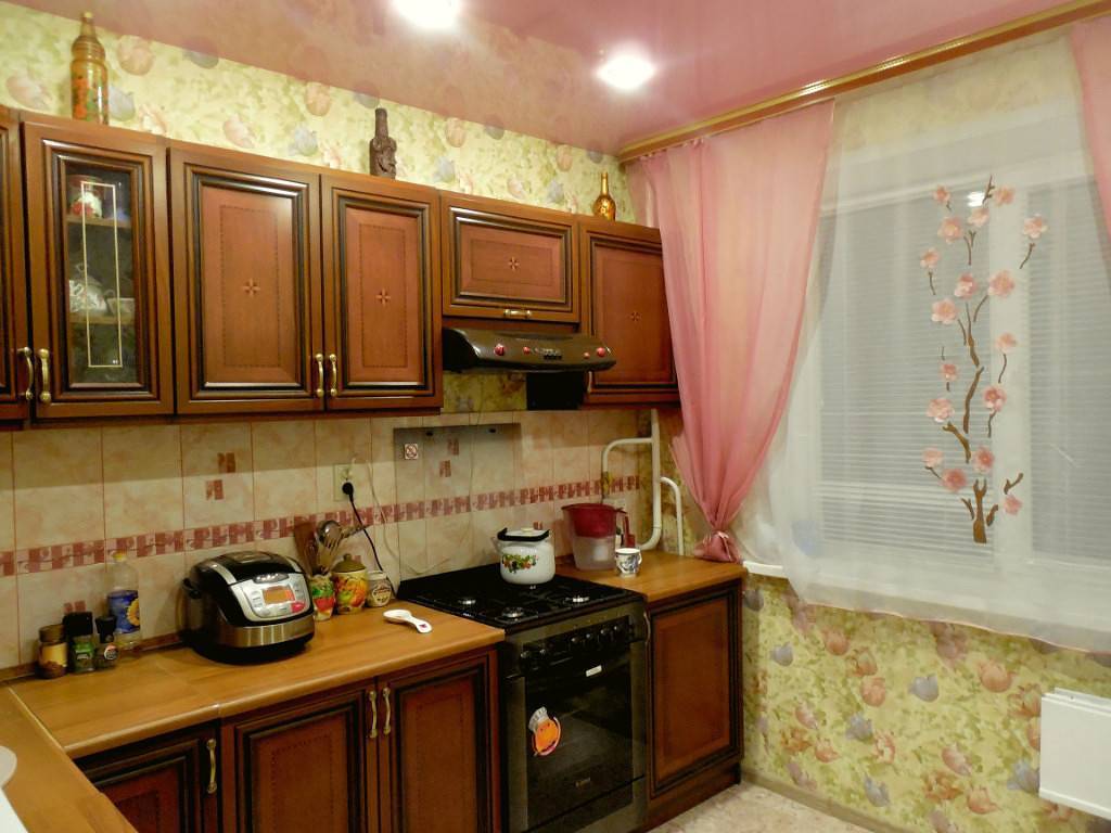 Если для стен куплены обои, гарнитур не должен сливаться с ними, а значит, здесь придется либо подбирать родственный цвет, либо противопоставлять один контраст другому. Например, на голубых обоях голубой гарнитур потеряется, даже если его цвет будет на несколько тонов ярче оттенка настенной отделки. К тому же нельзя забывать, что яркого в кухне не должно быть слишком много: от этого быстро устают глаза. Кроме того, излишне яркие краски нередко являются причиной подсознательного дискомфорта домочадцев при пребывании на кухне.