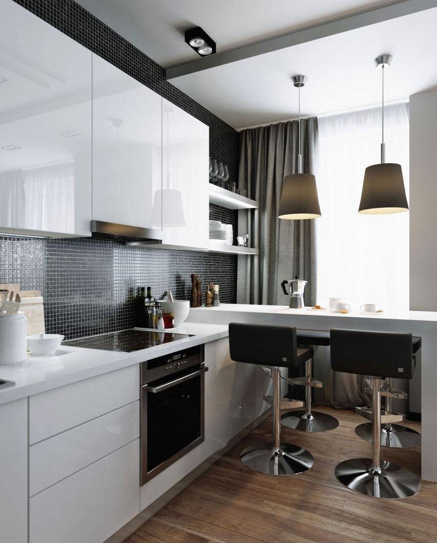 Выбор барной стойки и стульев также подойдет для мини-кухни – он сэкономит драгоценные сантиметры, а также может использоваться не только для приема пищи, но и как зона для приготовления еды.