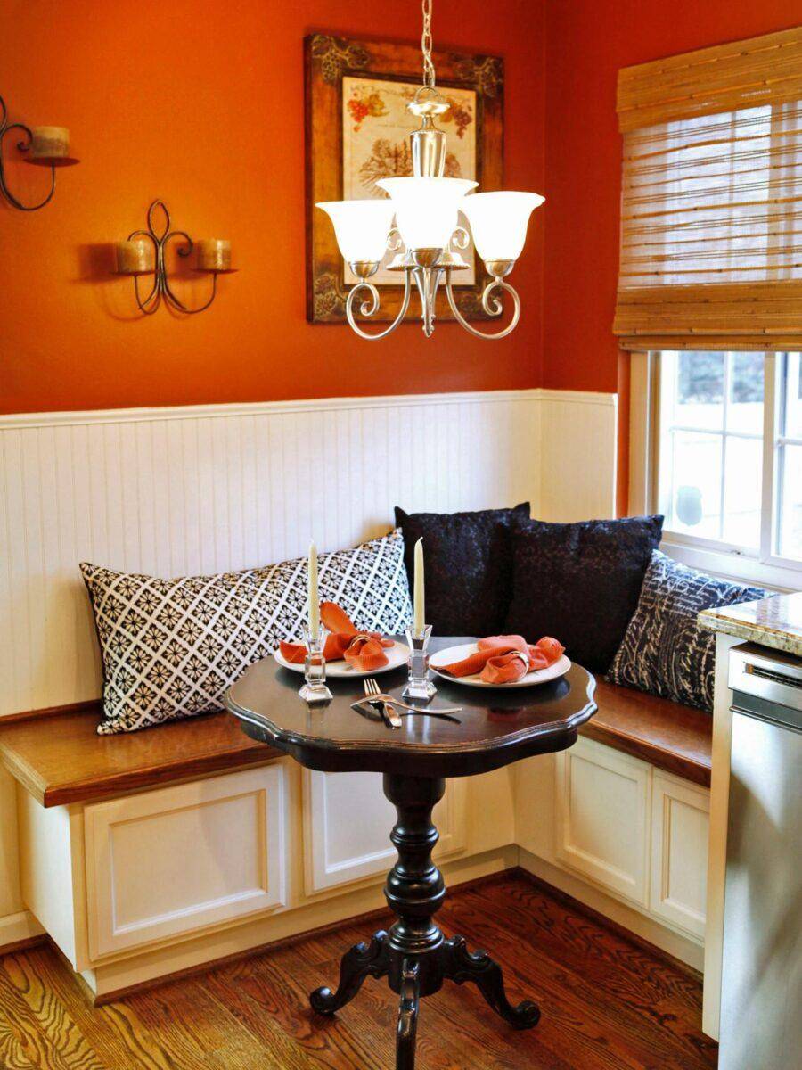 - Если вы выполняете интерьер кухни с диваном, повесьте светильник прямо над местом отдыха.