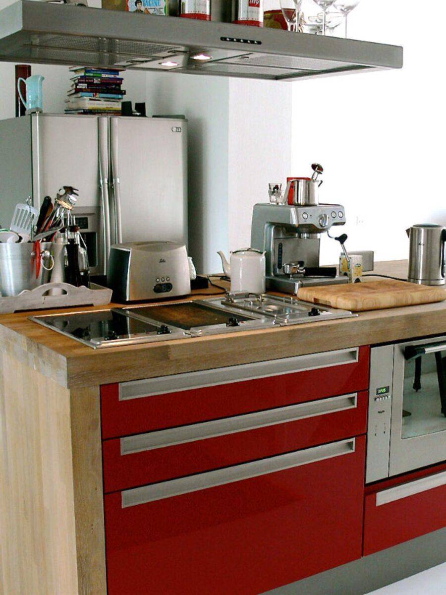 - Холодильник — если вынести его на балкон или в коридор нельзя, лучше всего установить его в углу рядом с окном, но подальше от батареи. Можно также использовать небольшой холодильник без морозильной камеры, встроенный в кухонный гарнитур.