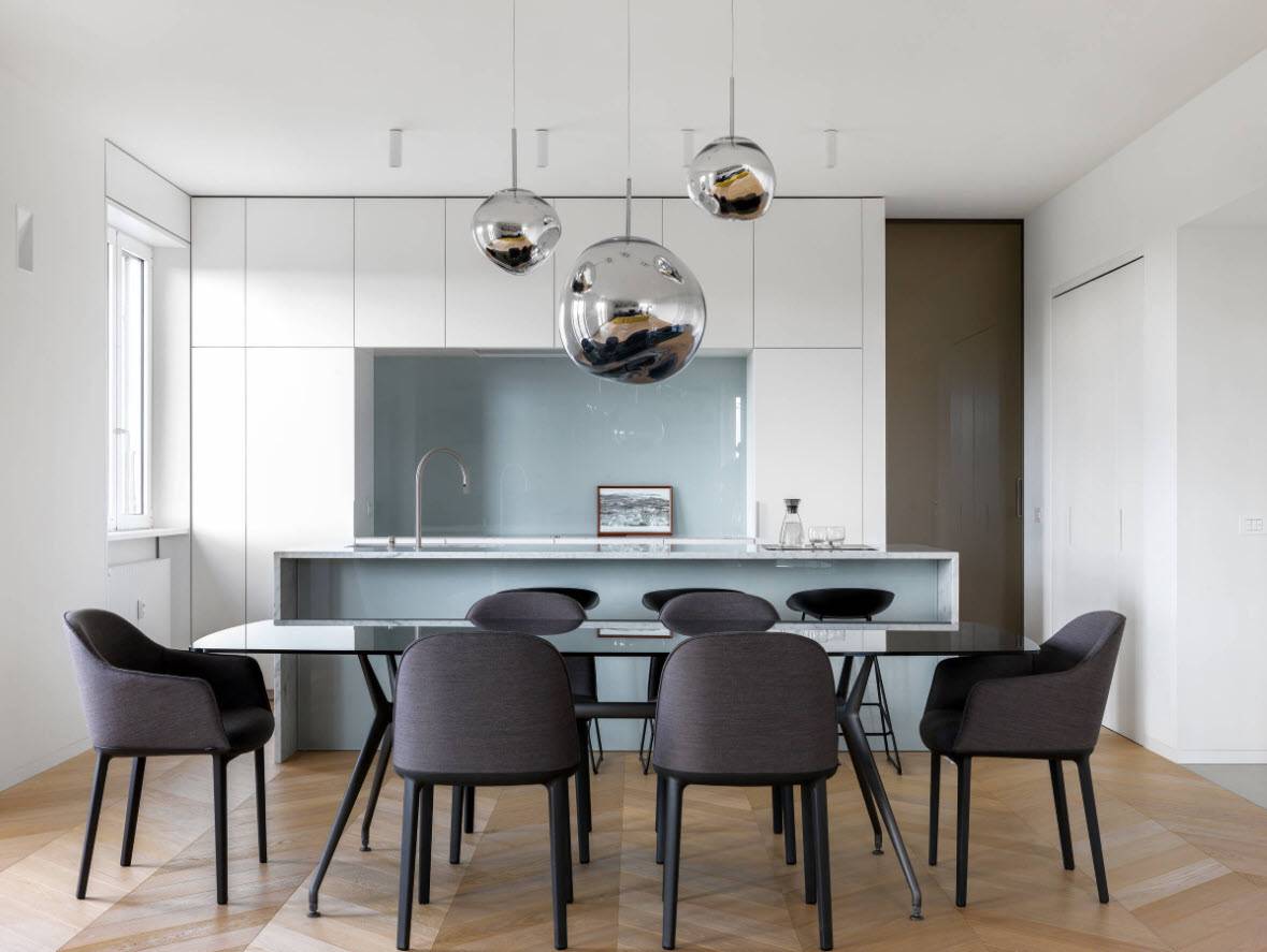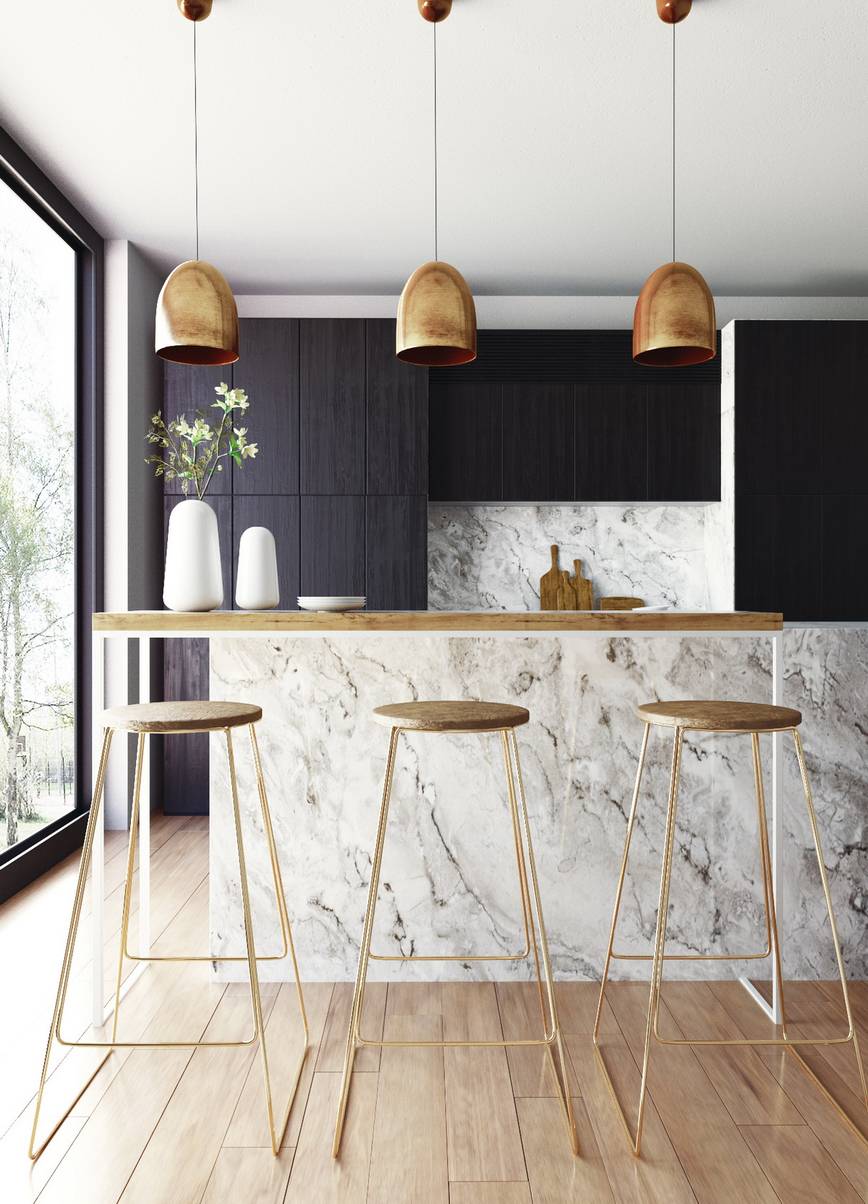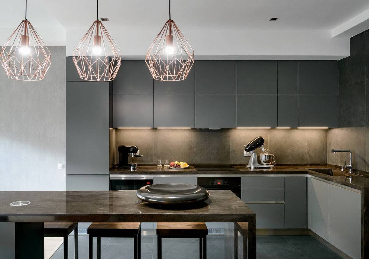 Разные светильники это хороший способ отделить обеденную зону от рабочей на кухне.