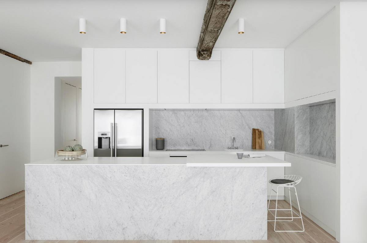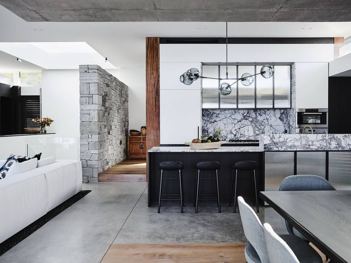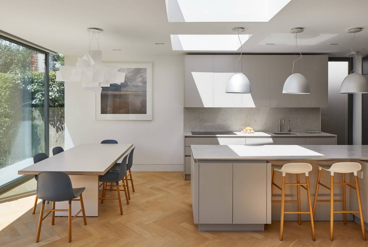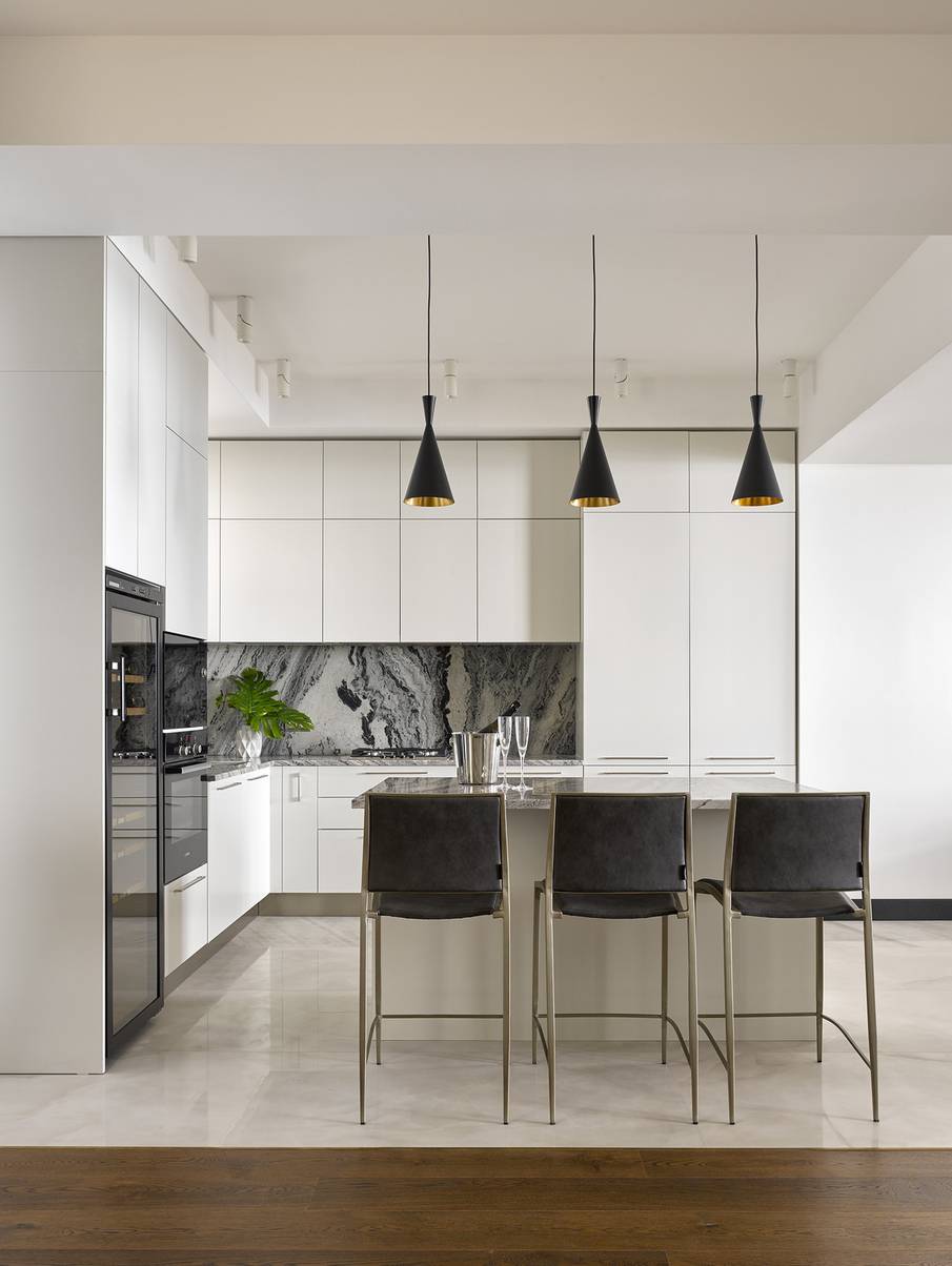 Разные светильники это хороший способ отделить обеденную зону от рабочей на кухне.