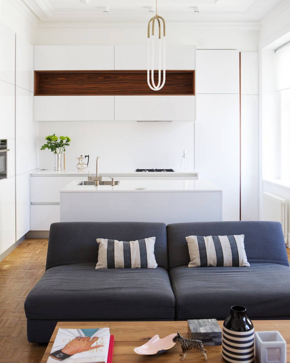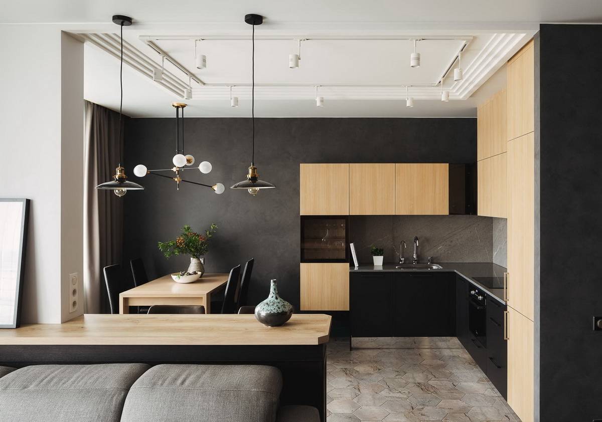 Если в гостиной будет традиционное освещение, а в зоне кухни – встроенная подсветка, задача разделения успешно выполнена.