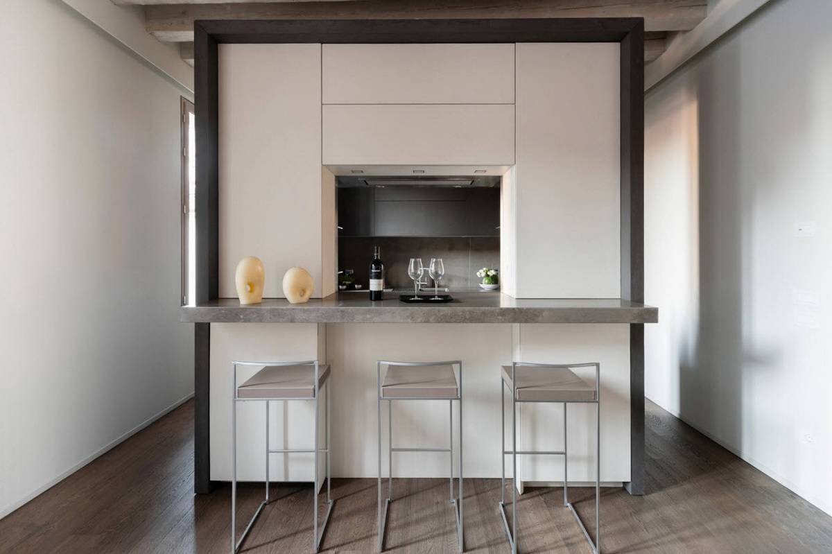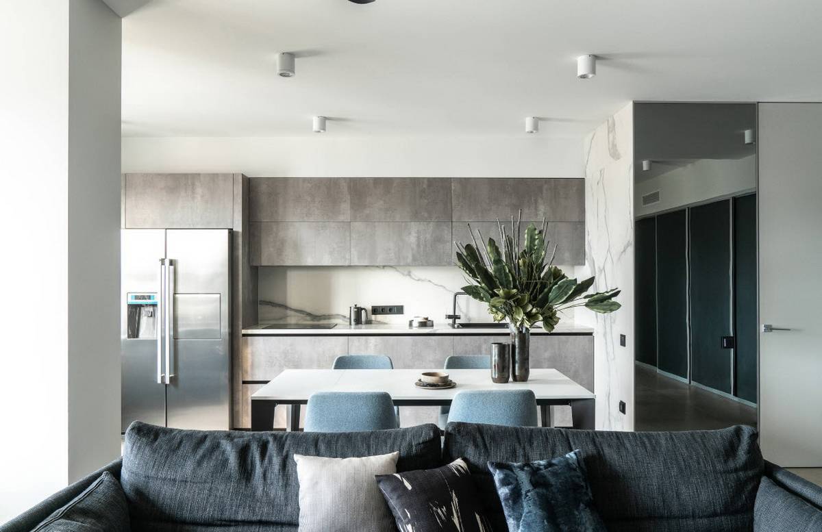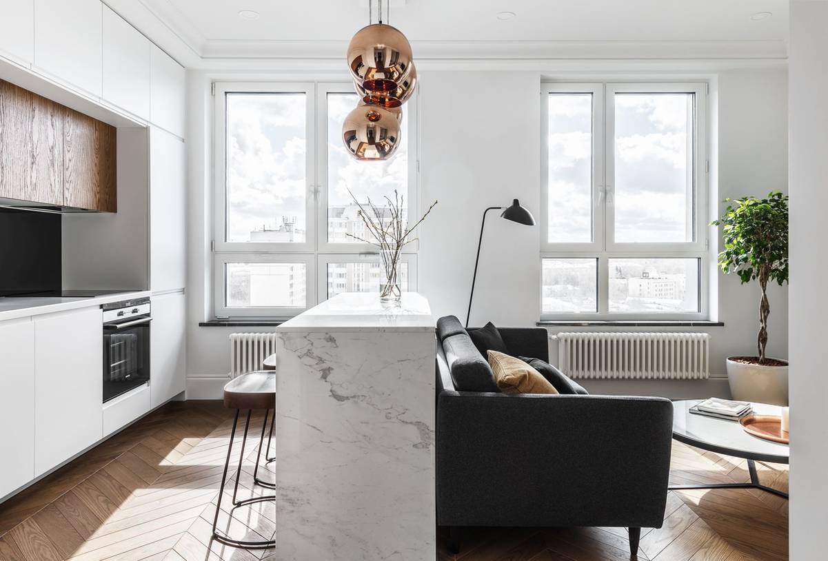 Зонирование лаконичной кухни с помощью стола-стойки.