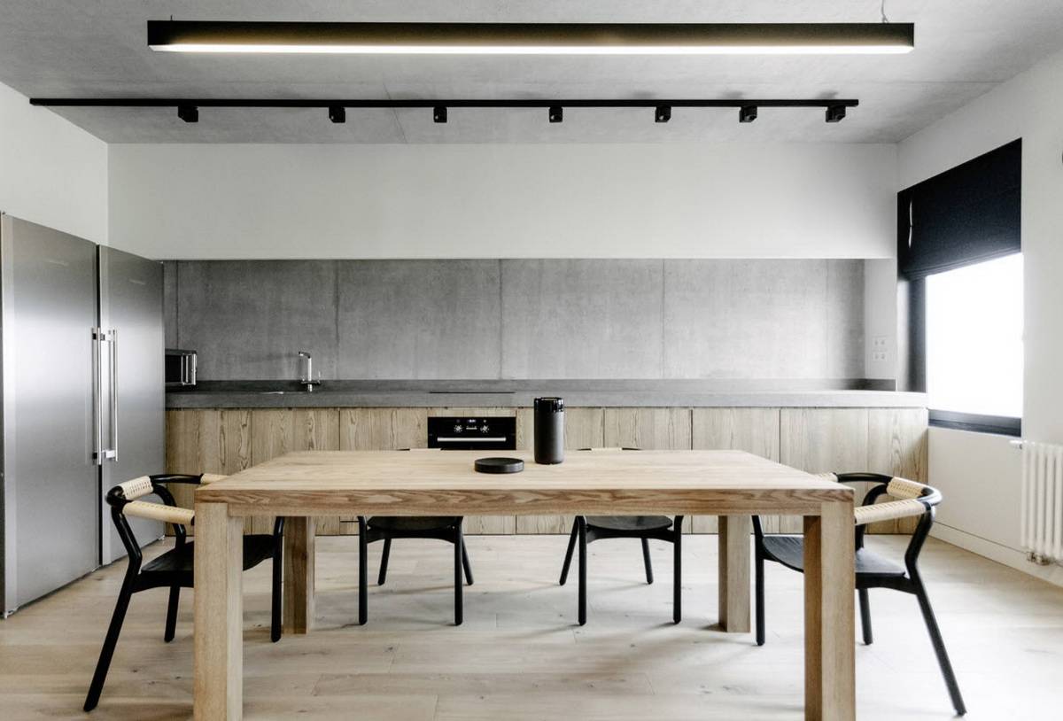 Минимализм в просторных помещениях не означает абсолютный отказ от чего-то привычного. Это, прежде всего, правильное зонирование пространства, которое может обеспечить барная стойка или обеденный стол. Возможно объединение этих двух предметов с сохранением функциональной нагрузки.