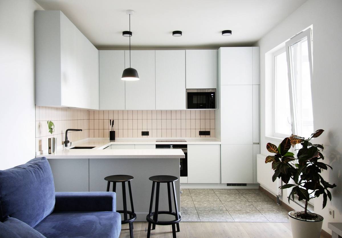 Неплохим решением станет полуостровная кухня. В этом случае рабочая зона отделена от пространства, где принимают пищу, барной стойкой или тумбой.