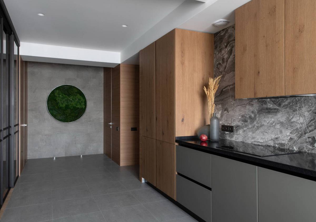 Доступное пространство позволяет по минимуму использовать фронтальную стену. На ней отсутствует кухонный гарнитур. Его заменяют простые прямые полки, в которые органично вписывается короб вытяжки. Предметы быта, установленные на полки, соответствуют стилистике противопоставления современности и классики. Фартук, как большая часть фронтальной стены, покрыт деревянными панелями. Это основная изюминка дизайна, которая привлекает взор наблюдателя в первую очередь. Она создает атмосферу уюта и ощущение близости к природе на фоне технологической функциональности других частей интерьера.