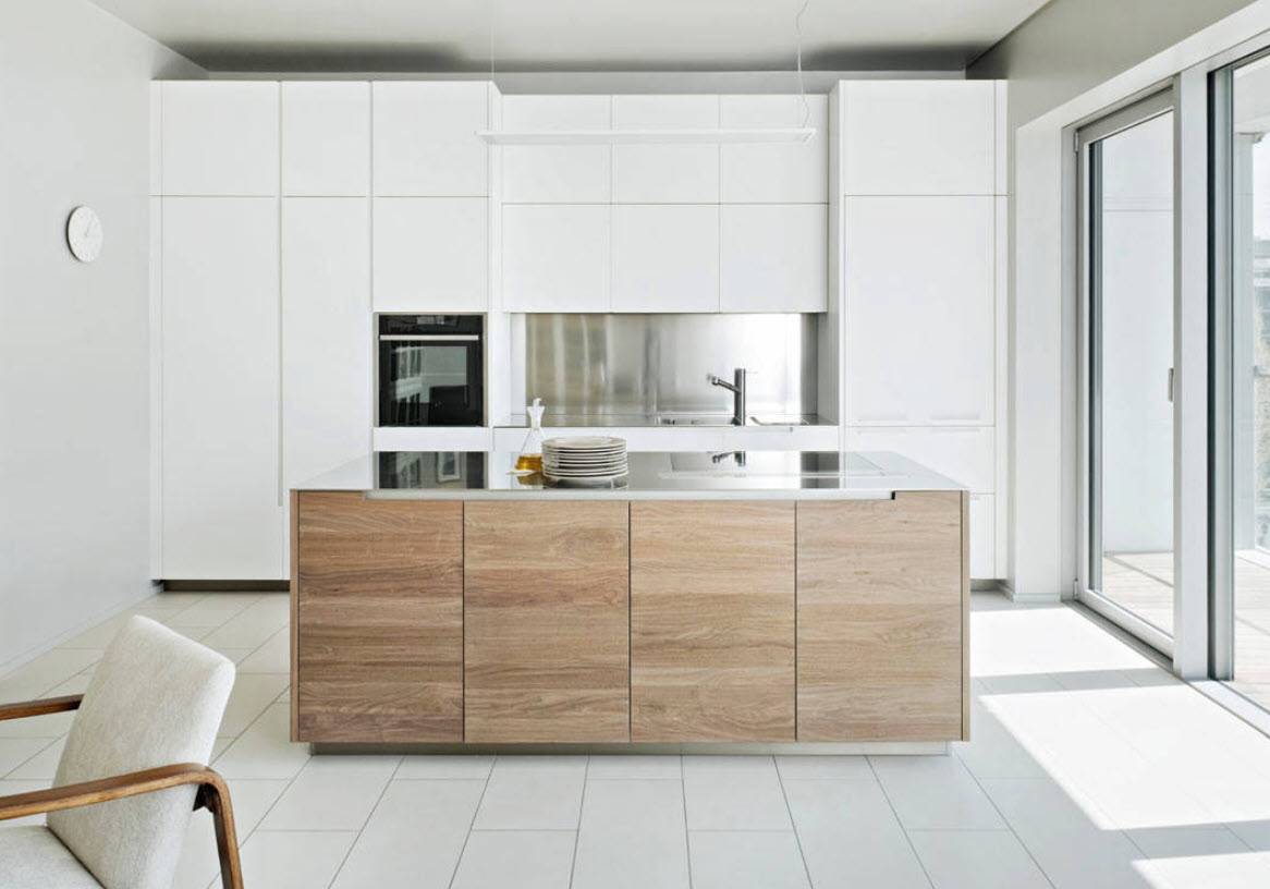 Это направление предполагает использование только самых необходимых элементов декора. Ничего не должно бросаться в глаза и отвлекать от четкой геометрии линий и воздушности пространства. Если вешается картина, то рамка для нее должна быть простой и гладкой. При использовании открытых полок на них не приветствуется нагромождение кухонной утвари. В идеальном варианте все лишнее скрыто за фасадом.