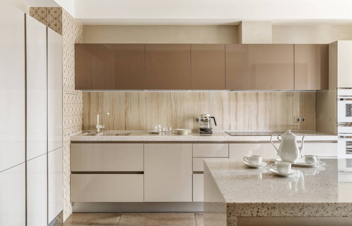 В минималистичном стиле кухонный гарнитур должен быть сдержанным и аккуратным. Не допускается никакого декора, выступов. Часто на дверцах даже нет ручек. Цвет всегда выбирается нейтральный, желательно однотонный.