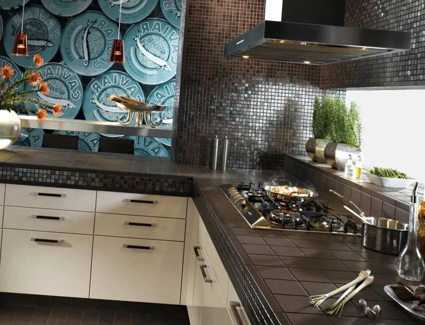 Особое внимание необходимо уделить оформлению фартука на рабочей зоне. Чтобы он служил дольше, здесь используют материалы, которые легко чистятся