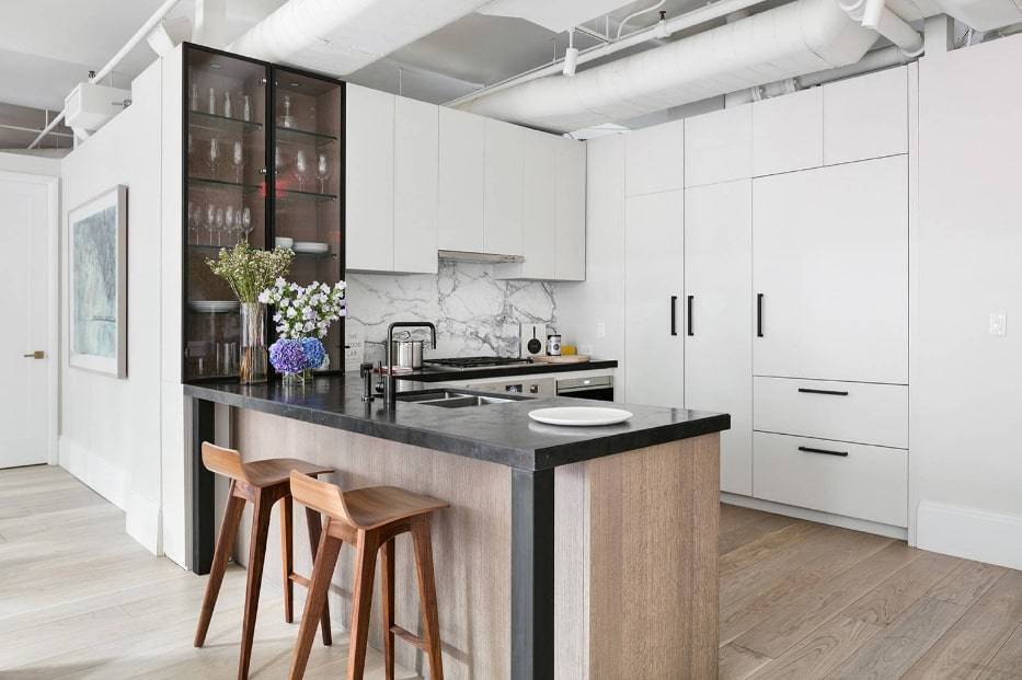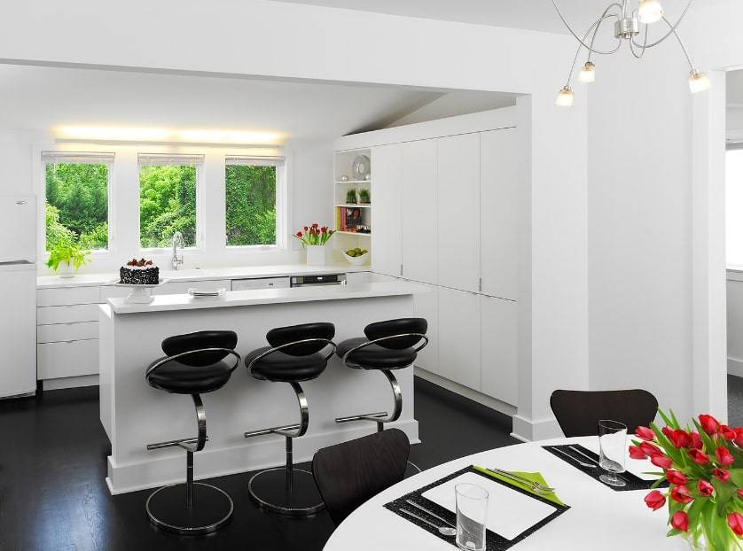 Дополнят уникальность интерьера простые белые фасады, контрастирующие с черной столешницей рабочей зоны и барной стойки, а также высокие барные стулья.