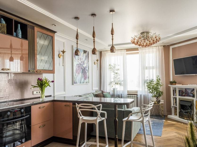 Хотите создать из малогабаритной кухоньки и не особо просторной гостиной изумительный дизайн объект? Ваш выбор – композит минимализма и арт-деко.