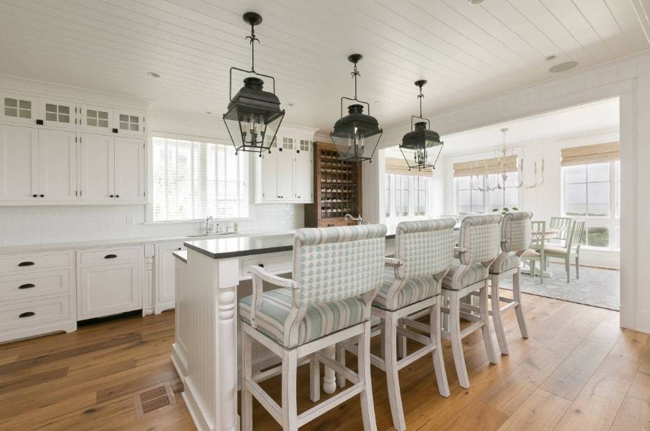 Стильные светильники привлекут внимание к бару, а также добавят теплую, уютную атмосферу. Подвесные светильники являются наиболее популярным освещением для дизайна кухни с барной стойкой, особенно из-за их продольного расположения, которое так часто повторяет форму бара
