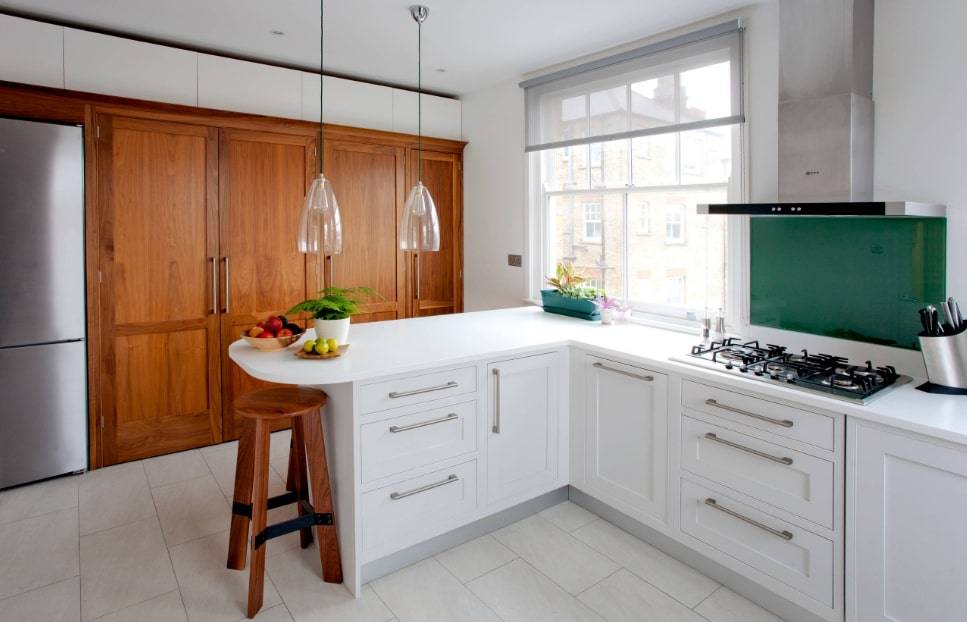 Барная стойка вдоль окна – оптимальное решение для маленькой кухни.
