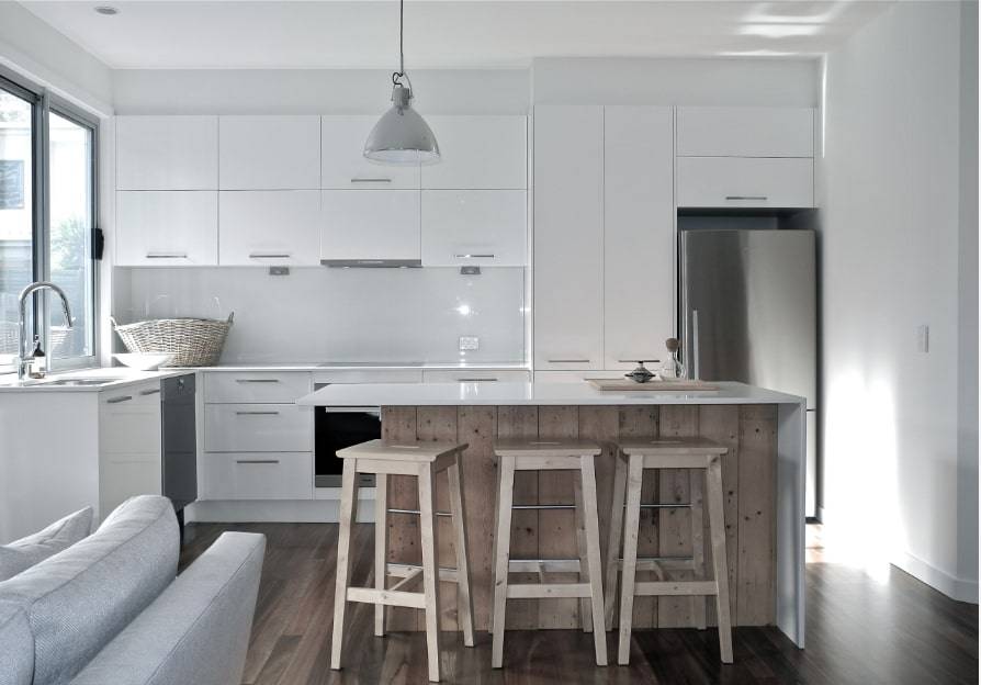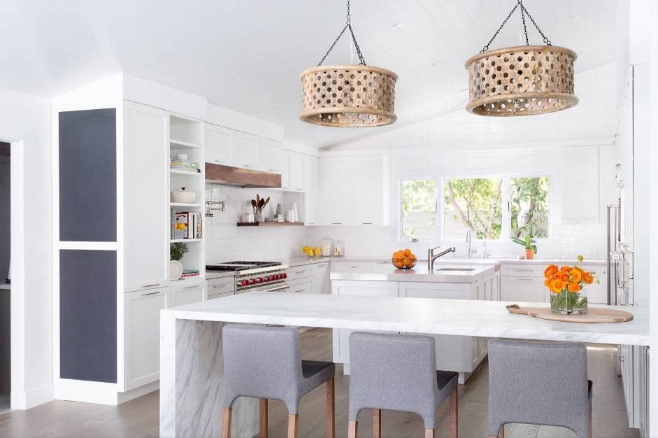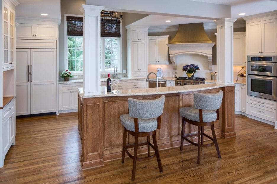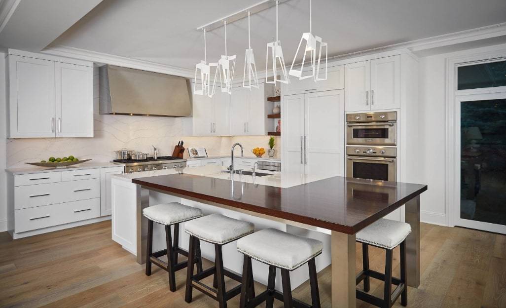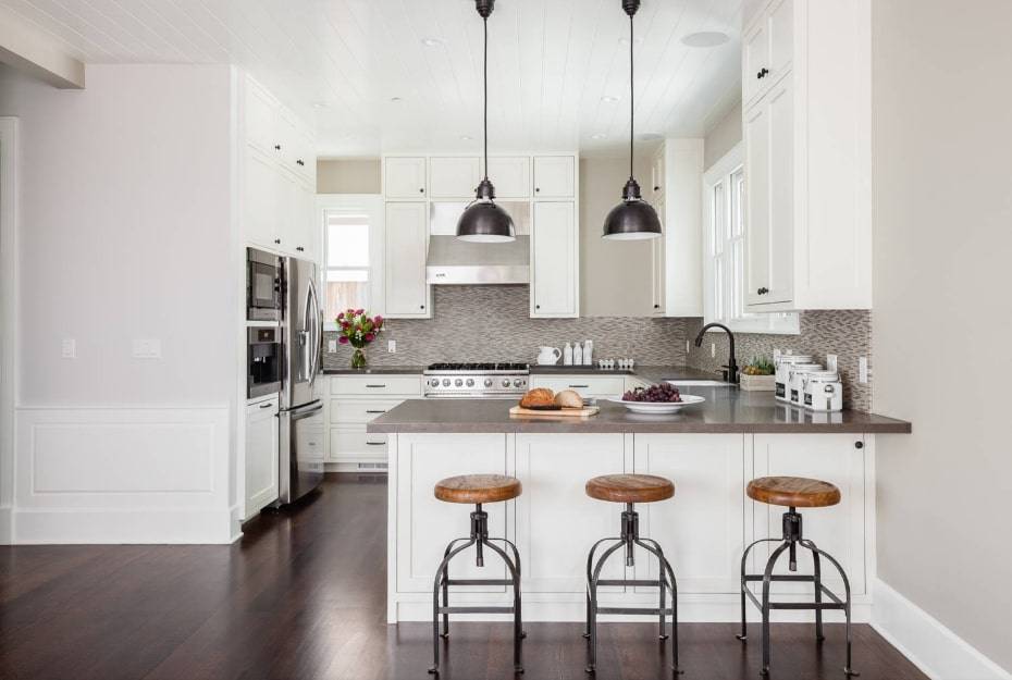 Один из наиболее распространенных подходов добавления барной стойки, заключается в использовании половины кухонного острова в качестве рабочей поверхности, а другой – в качестве поверхности для бара.