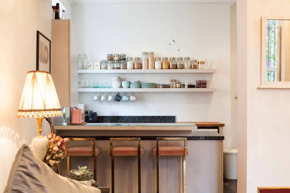 Барная стойка вдоль стены — отличный вариант для маленьких и узких, вытянутых кухонь, где нет возможности совместить ее с кухонным гарнитуром или островом.