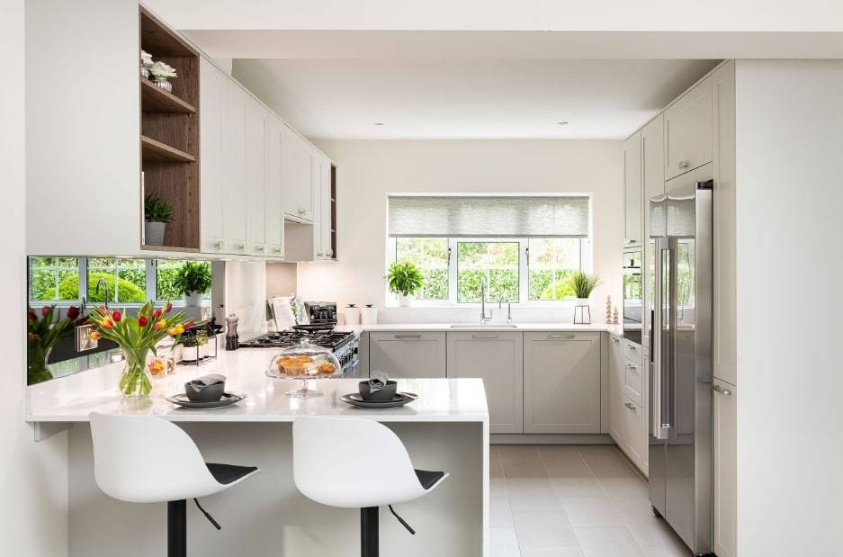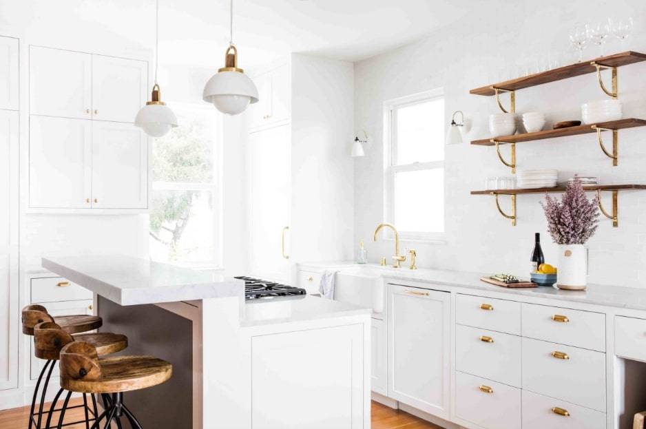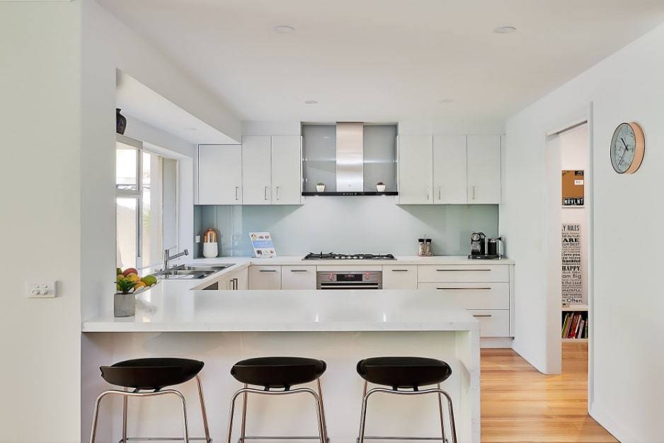 Красота этой кухни заключается в том, что белый цвет делает это пространство очень чистым и безупречным. Белый всегда является первым вариантом для цвета для кухни. Барная стойка в данном дизайне отлично дополняет. Чтобы создать более стильный внешний интерьер, установите столешницу, которая нависает над устройством, чтобы создать ощущение стола.