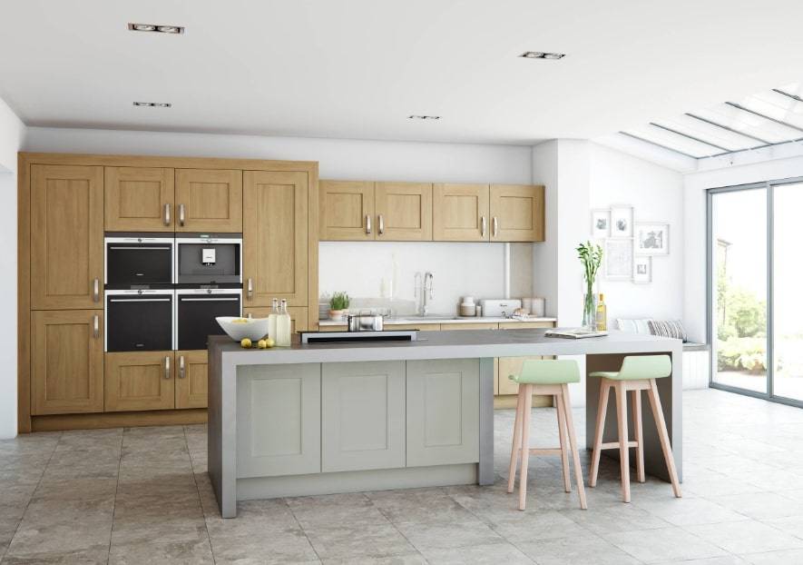 Кухонный гарнитур и столешницы в данном дизайне сделаны из клена. Материал соответствует серому цвету стен