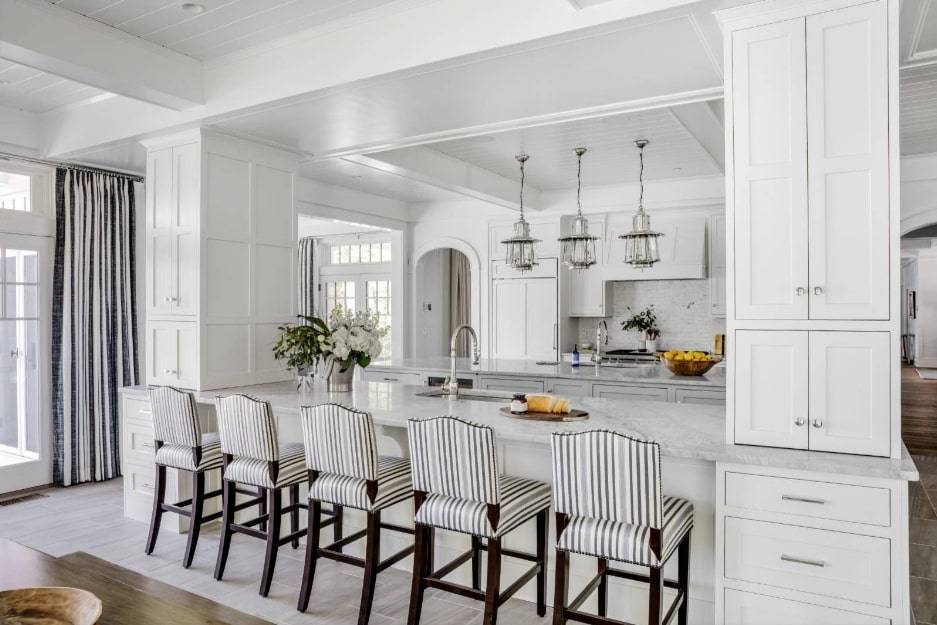 Естественное освещение для этой кухни делает пространство еще ярче с белым и кремовым оттенком для столешниц и шкафов. Барная стойка контрастирует с комнатой, плюс уникальный дизайн делает все это очень даже милым.