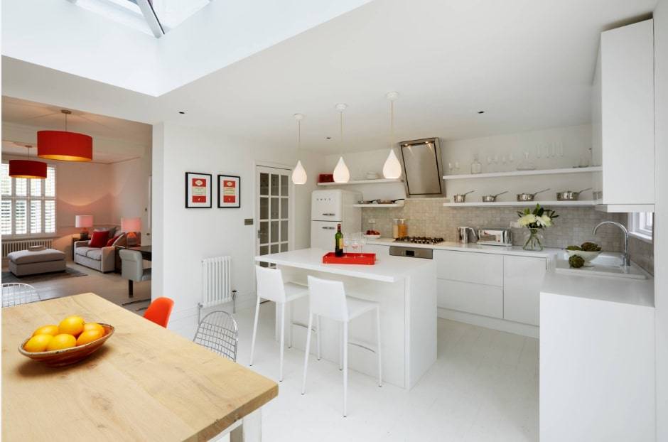 Переходным звеном между кухней и гостиной может выступать обеденная зона.