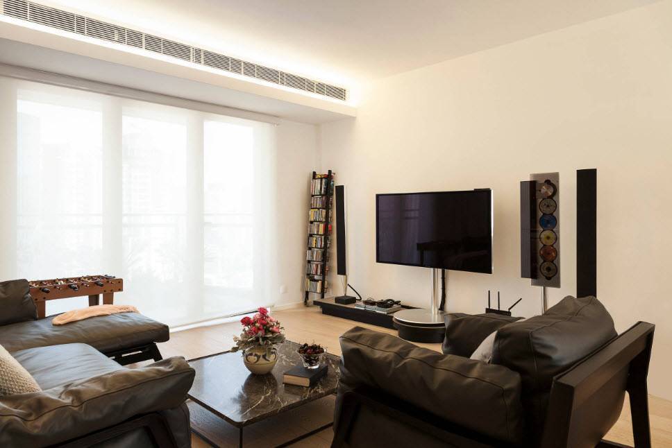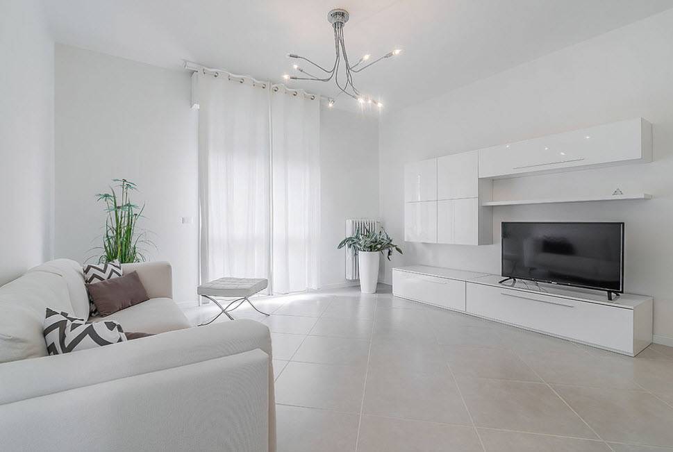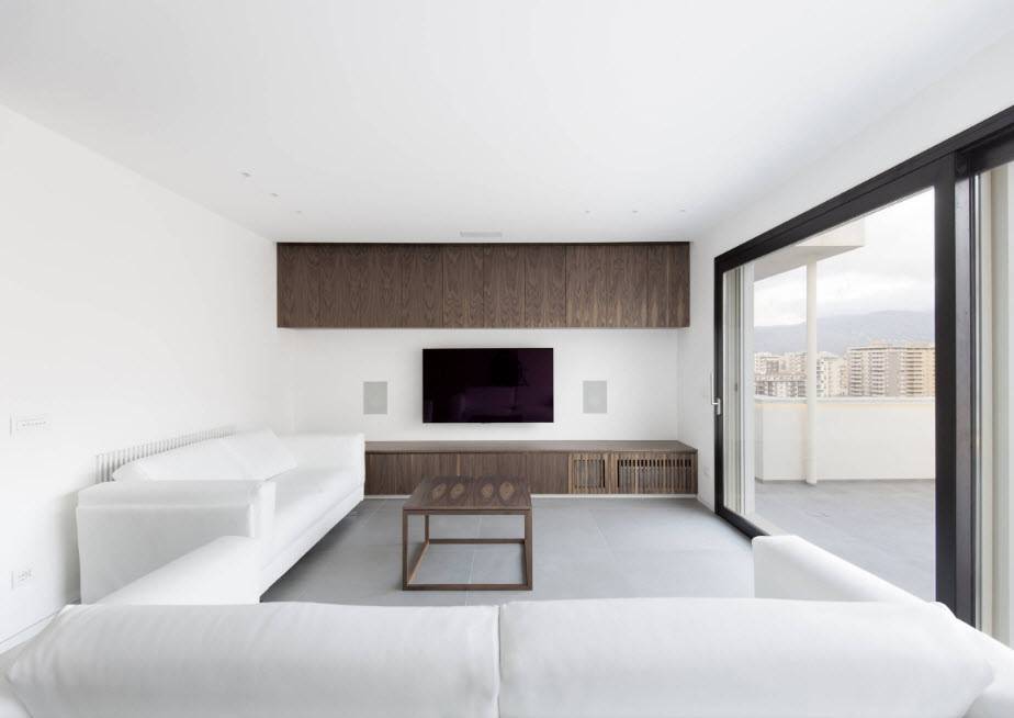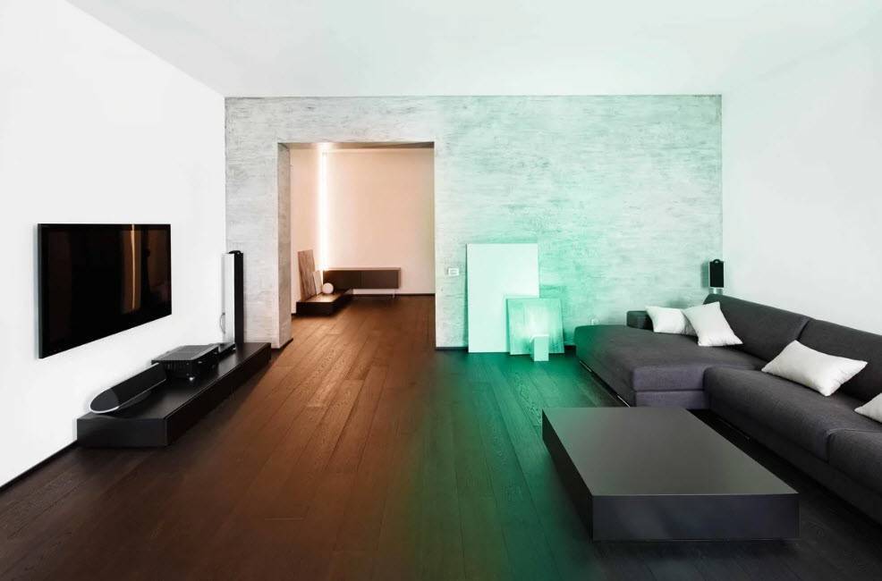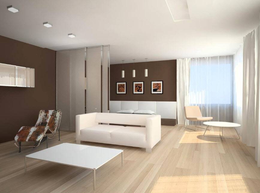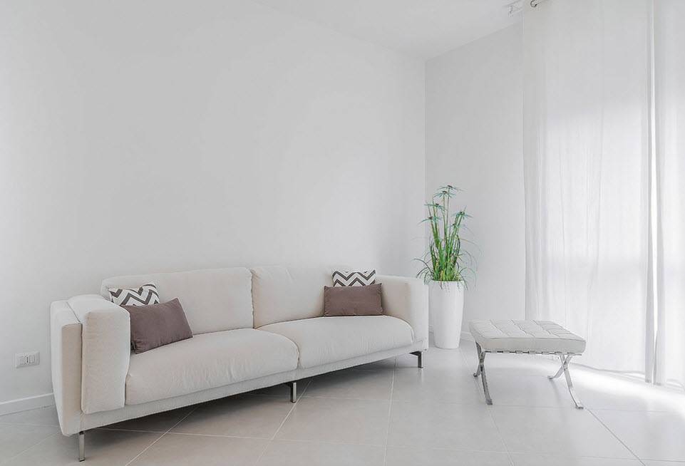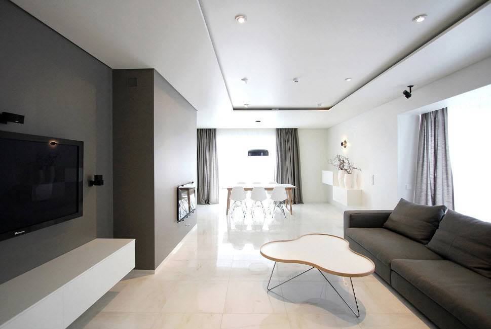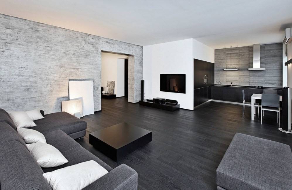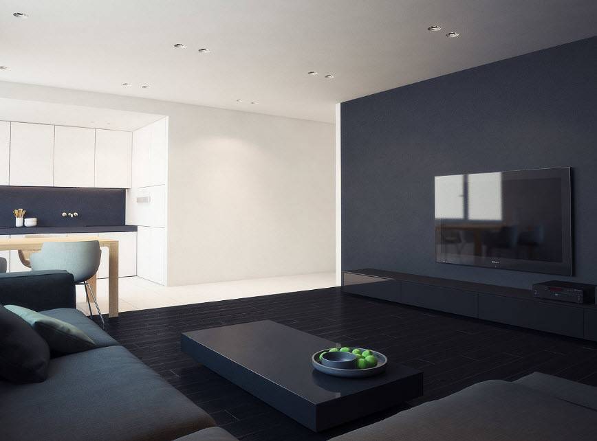 Стены в минимализме, как правило, выполнены в одном тоне – в основном они светлые, но иногда бывают и темными. Рекомендуется выбирать холодные светлые тона – так удается добиться визуального увеличения пространства.