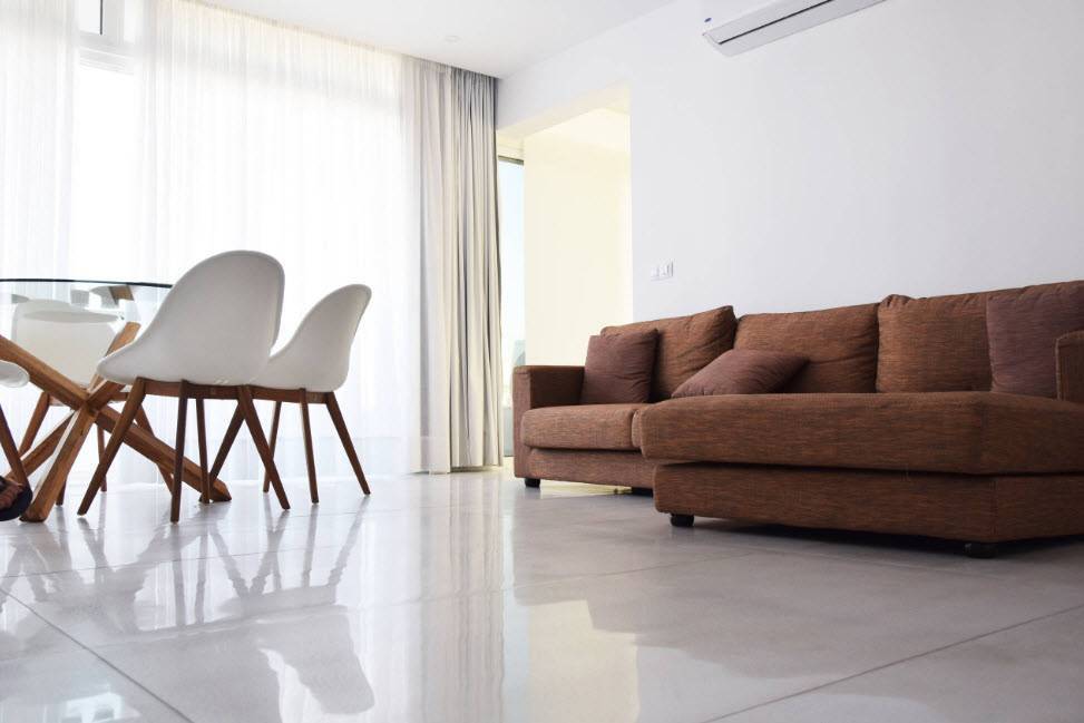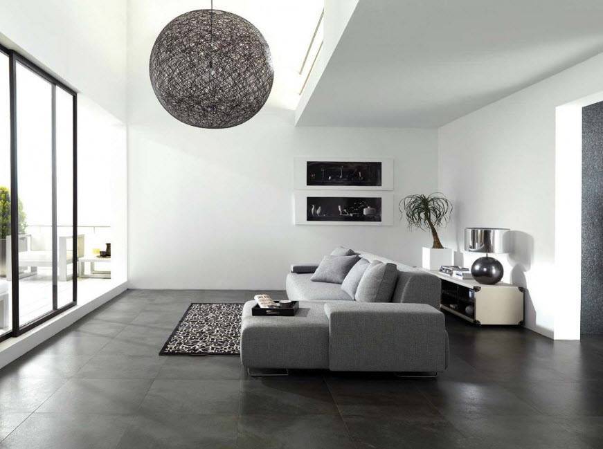 Хорошим решением станет и керамогранит без рельефа либо же повторяющий древесный или мраморный узор. Кстати, дизайнеры не советуют выбирать чисто черные или белоснежные цвета полов, ведь уход за таким покрытием будет в разы сложнее. Более практичным решением станут серые, пастельные тона, беж, светло-коричневый.