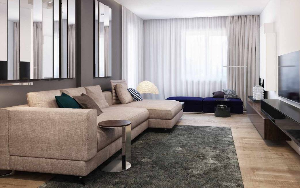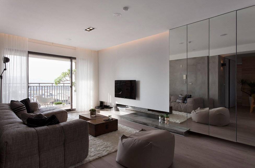 В дизайне гостиной будет как нельзя уместен встроенный шкаф-купе. Да, вы потеряете пространство, но выиграете намного больше за счет зеркального фасада и убранных с виду вещей.