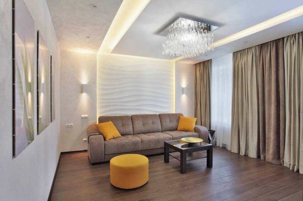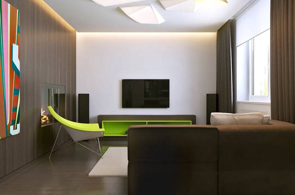 Минимализм – это стиль, который любит естественное освещение. Если окна небольшие или они выходят на северную сторону, то гостиную нужно оформить в теплых тонах, дополнив ее соответствующими светильниками. Текстиль здесь практически не используется, разве что для того, чтобы скрыть себя от соседей, сделать это помогут жалюзи или римские шторы. В качестве светильников лучше использовать точечные светильники, скрытую или неоновую подсветку. От больших плафонов и люстр лучше отказаться, так как они не соответствуют данному стилю. В качестве декора здесь можно использовать картину, яркое настенное панно или импровизированный сад из камней, но не более.