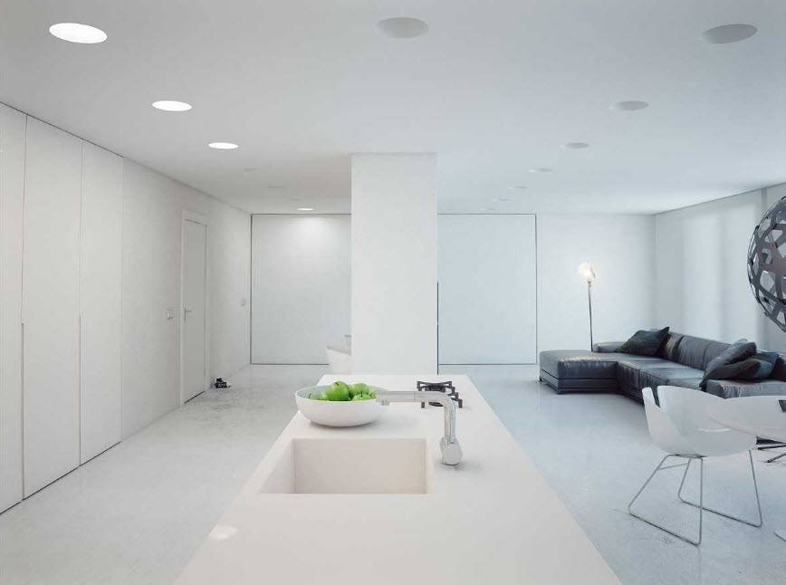 - При большом объёме помещения пространство должно быть зонировано, то есть, его можно разделить многоуровневым освещением. Так, минимализм на кухне в плане осветительных приборов достигается функциональной направленностью того или иного светильника, когда освещается определённая зона помещения (см. фото вверху).