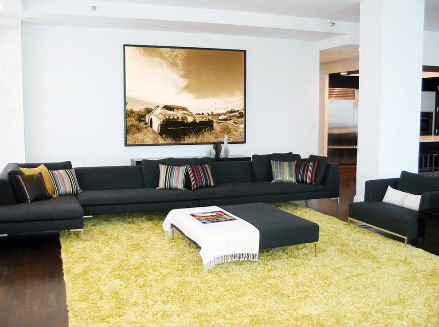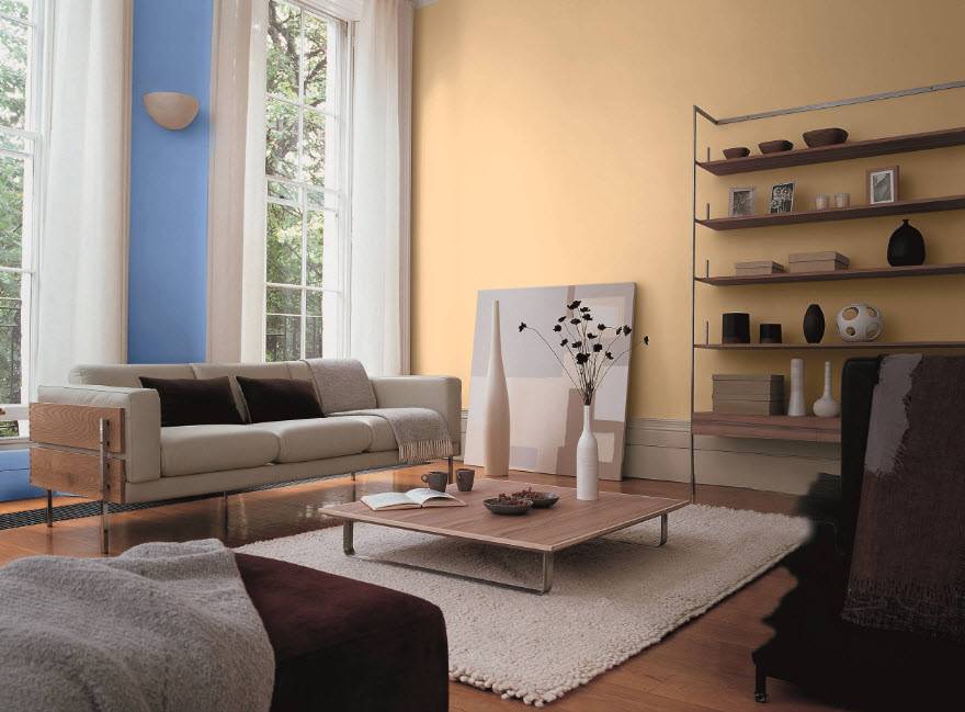 Для оживления обстановки и придания ей непринужденности применяют яркие акценты, например, голубой или оранжевый диван либо красочный пуфик. Главное – не делать слишком много цветовых пятен! Одного-двух элементов вполне достаточно.