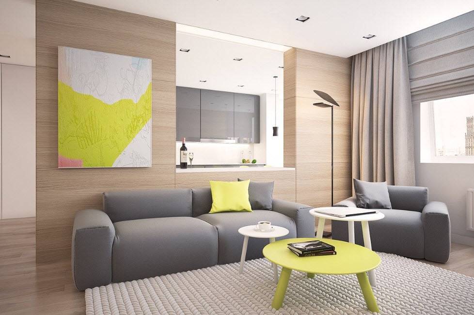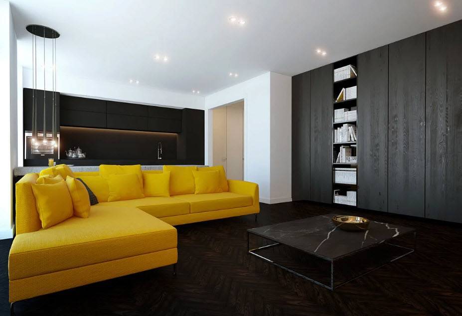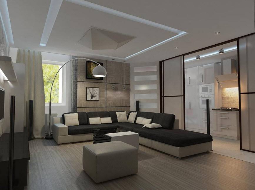 Мебели в гостиной, совмещенной с кухней, должно быть как можно меньше, как и бытовой техники. Тут подойдут многофункциональные или встроенные модели.