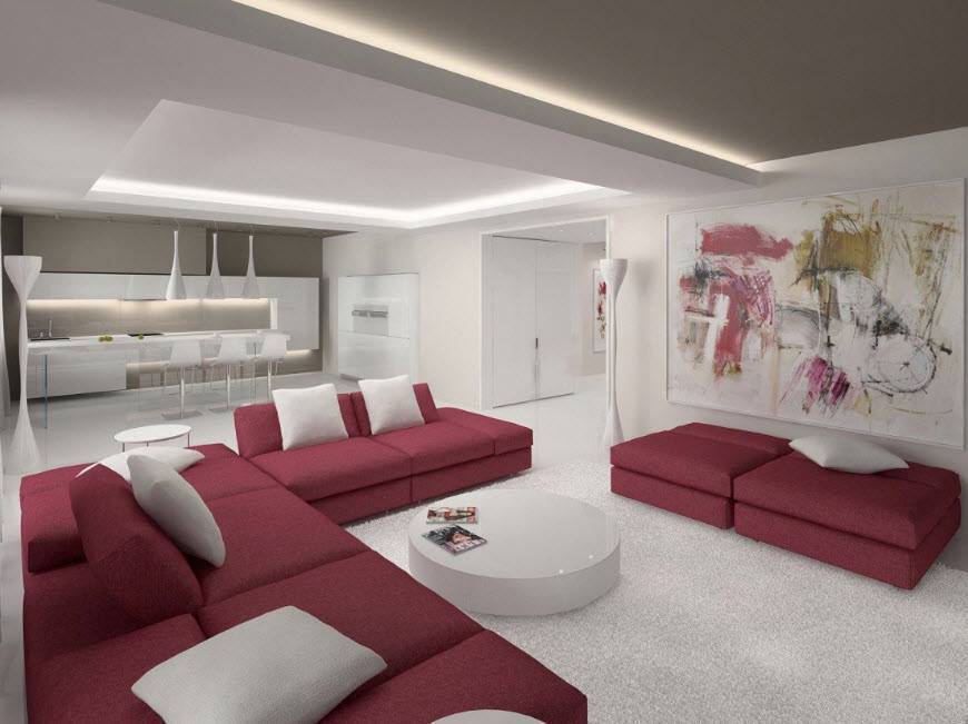 Стильная кухня гостиная минимализм предполагает удобство и большое количество пространства, а потому нужно избегать нагромождения мебели и других вещей.