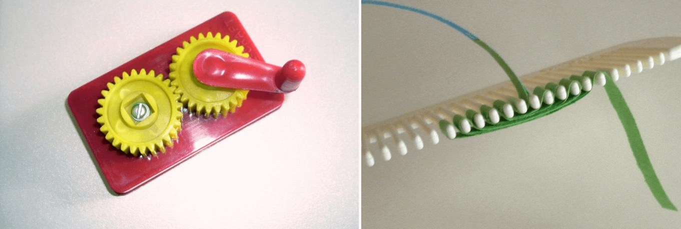 Гребень с длинными зубцами прекрасно подойдет для петельчатого бумагокручения. Если полоски решено нарезать самостоятельно, то потребуется макетный нож, линейка, специальный коврик в клетку для нарезки. В качестве дополнительных элементов используется всевозможный декор – цветные нитки, пряжа, ленты, проволока, стразы, пластиковые глазки-носики и др.