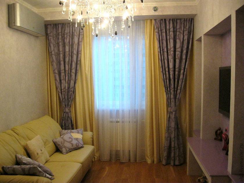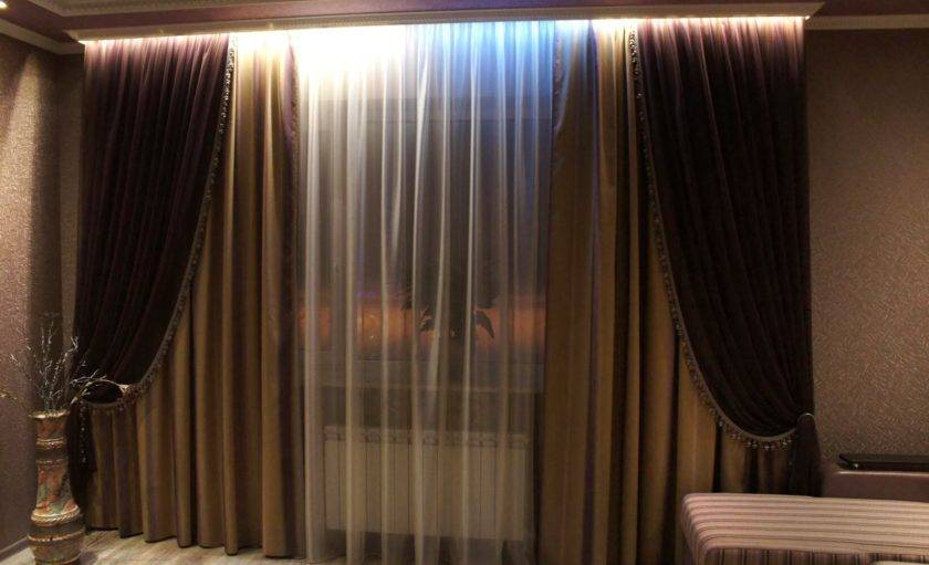 Распространенная технология, при которой сочетается легкая гардина (можно использовать тюль) и плотные навесы.
