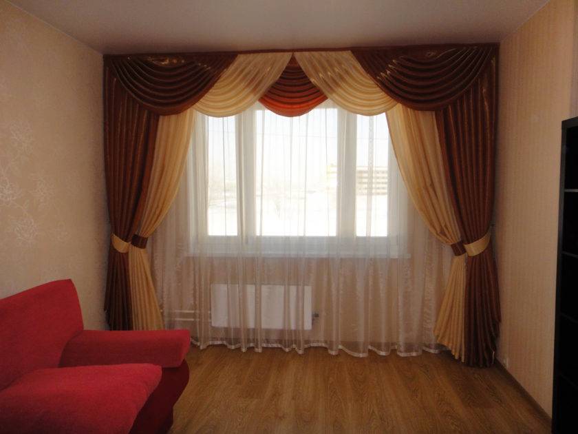 То, что оформление окна должно сочетаться с цветовым решением мебели и потолка, а также напольного покрытия – вполне очевидно. Но вот геометрические размеры ламбрекена, и в первую очередь – длина, подбираются в соответствии с конструктивными особенностями декорируемого проема.