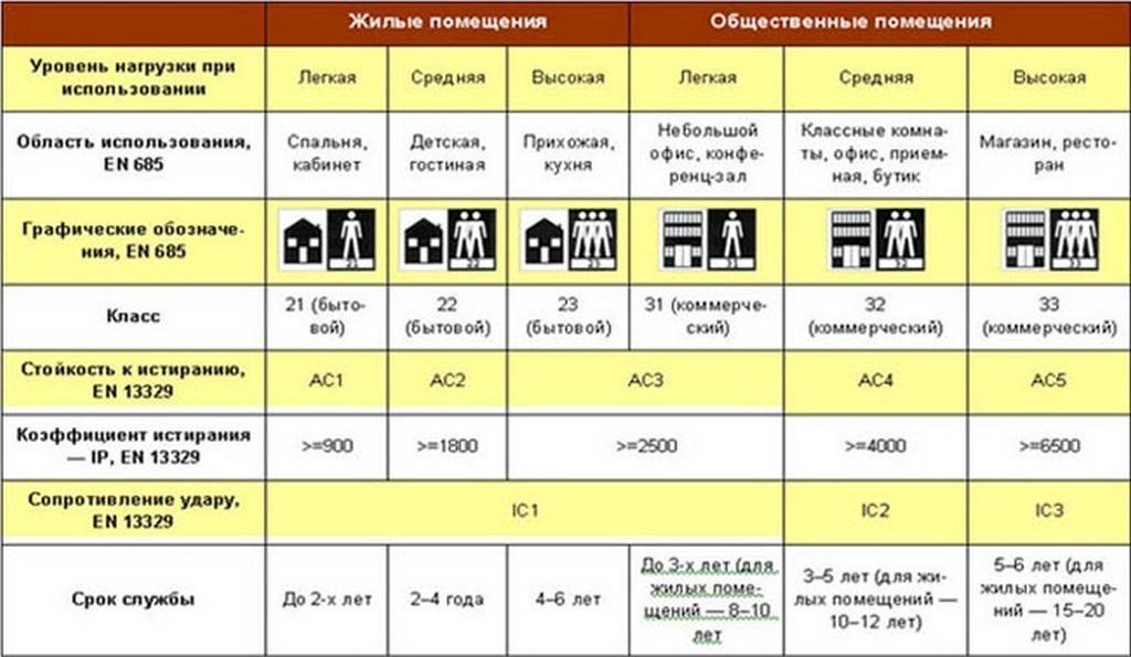 При выборе напольного ламинированного покрытия можно встретить такое понятие, как классы эксплуатации. Это информация о том насколько он устойчив к механическим повреждениям, а соответственно где его можно использовать. Проверяются следующие критерии: