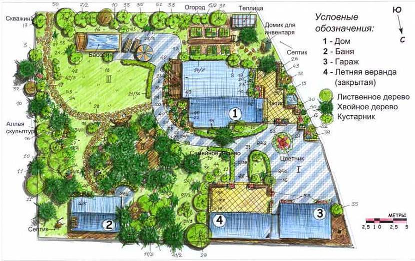 Чтобы учесть все нюансы, рекомендуется сделать проект. Он представляет собой горизонтальную проекцию вида участка сверху. На чертеж наносят все имеющиеся и планируемые постройки, места для отдыха (навес, гамак, стол), деревья, кустарники, огород, дорожки, бассейн, игровую площадку, декоративные элементы (скульптура, фонтан), клумбы и живые изгороди. Каждый элемент нужно точно измерить и нанести на схему в определенном масштабе.