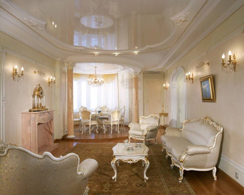 Потолок может быть отделан золотистой лепниной. Неизменный атрибут – это камин, белый портал которого можно украсить картиной и свечами.