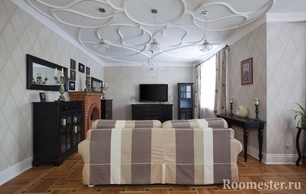 Лепнина придает интерьеру гостиной уютный классический стиль, стены выглядят более интересными и сложными