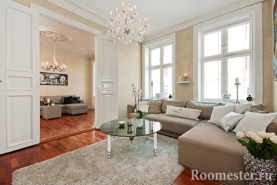 Комната будет выглядеть более просторной, если имеет высокие окна и бежевую гамму.
