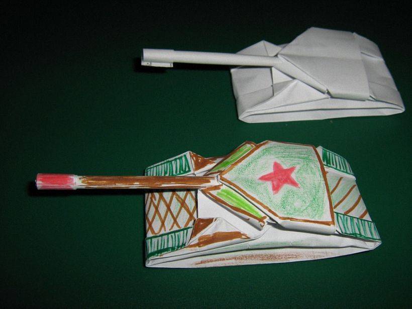 Для наиболее лучшей надежности конструкции можно укрепить клеем, а для визуального эффекта танка – разукрасить. На этом первая модель танка выполнена. Вряд ли она будет выглядеть оригинально и уникально, но всё же она порадует Вас.