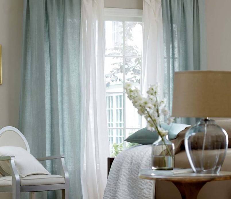 Профессионалы советуют выбирать для спальни льняные шторы простого кроя – с крупными, объемными складками, но без лишнего декора в виде ламбрекенов и пышных драпировок. Если решите дополнить шторы тюлем, его также желательно выбирать из натуральных тканей, так как синтетика, даже самые дорогие ее виды, скорее всего, будет плохо сочетаться со льном и нарушать гармонию интерьера.