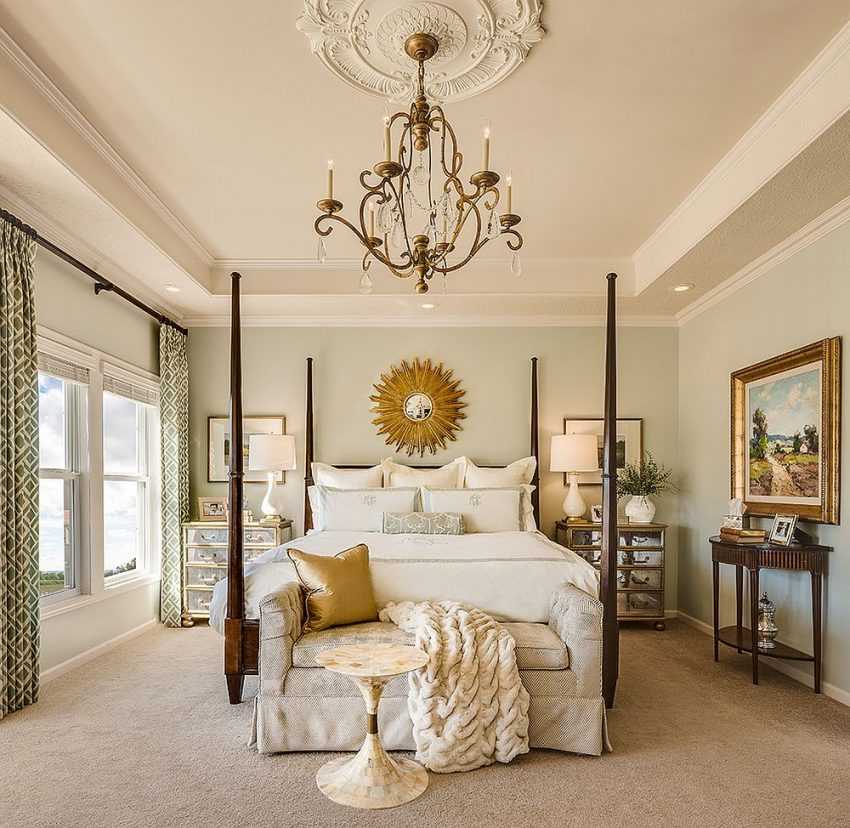 На фото хрустальная люстра вписывается в декор классической спальни. Позолоченные детали, роспись на стенах и двухуровневый потолок с белой лепниной создают изысканный образ.