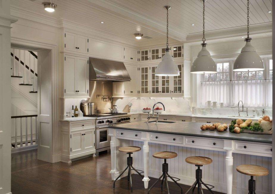 Люстра в кухне – это компактный потолочный светильник, которому не страшна влажность и который просто чистится, поэтому предпочтение стоит отдать изделиям с самым простым дизайном, лучший материал – металл, допускается использование стекла, но мыть его придется очень часто. Для небольших кухонь подойдут потолочные споты, в которых отдельные светильники могут двигаться, благодаря чему меняются зоны подсветки.