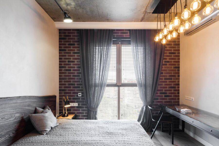 Спальня в стиле лофт предполагает грубую отделку в виде кирпичной кладки, штукатурки, состаренного дерева или бетонного покрытия. Поэтому многие люди считают, что такую обстановку нужно дополнить соответствующим светильником, отличающимся лаконичностью. Однако в лофтовое пространство может идеально вписаться роскошная многоярусная конструкция из хрусталя, которая еще больше подчеркнет индустриальность дизайна.