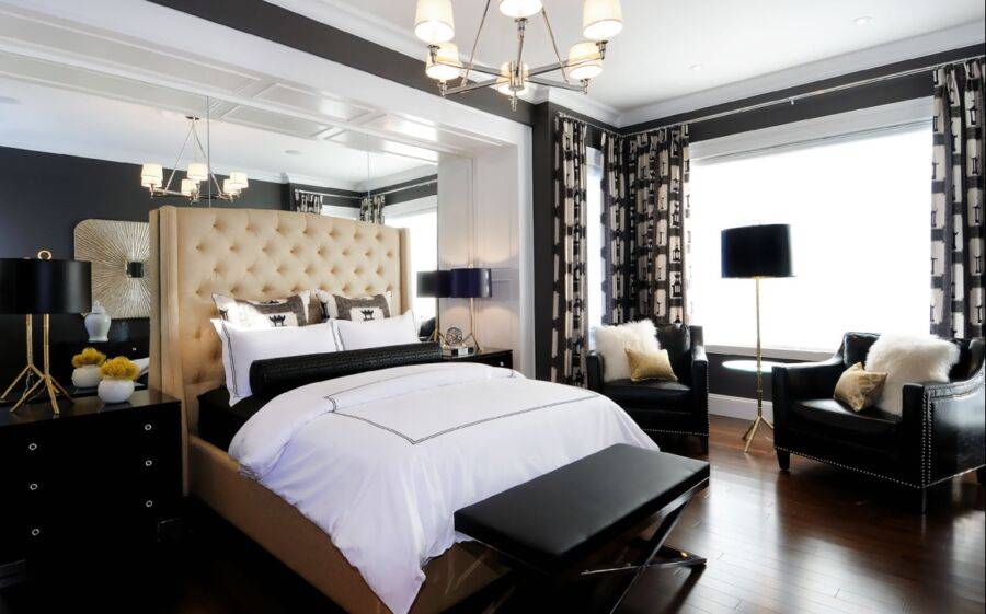 Современные люстры для спальни изготавливают в холодных белых, черных, серых цветах из прочных и практичных материалов: